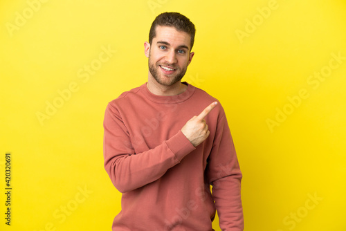 Handsome blonde man over isolated yellow background pointing to the side to present a product