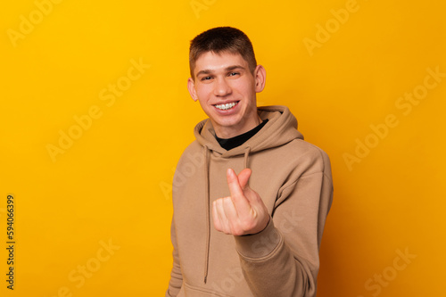 Handsome wide smiling man is showing Korean heart gesture with his fingers.