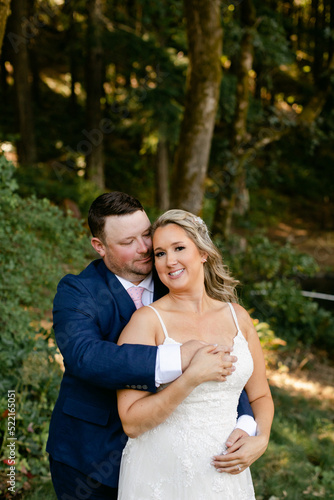 Happy Couple on Wedding Day Hugging in the Woods