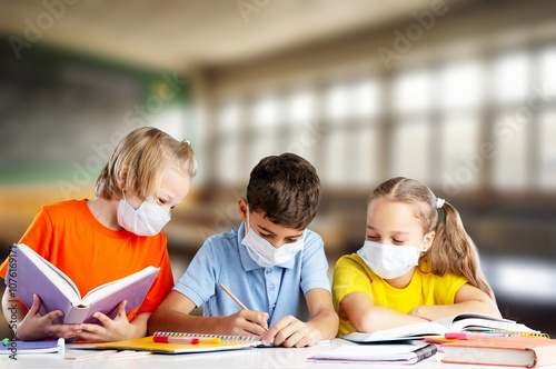 Happy cute school kids learning in the class.