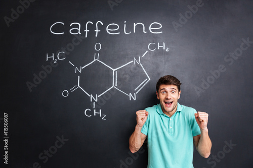 Happy excited man celebrating success over drawn caffeine molecule structure