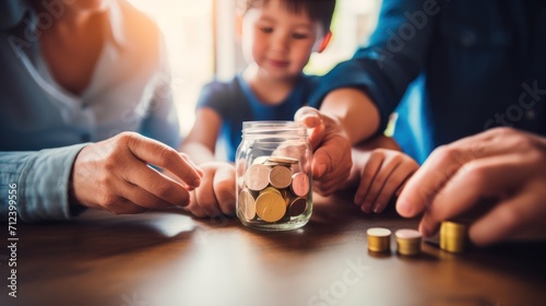 Happy family saving money into piggy bank, saving money concept