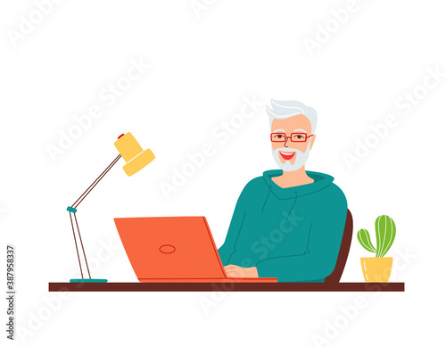 Happy smiling gray-haired elderly man is sitting at a table with a laptop. Concept for remote work and education from home, e-learning, retraining for active retired seniors. Vector illustration