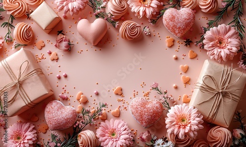 happy st valentine s day holiday concept greeting card design, gift boxes heart shaped candles flowers on peach color background.image