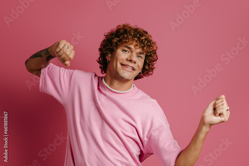 Happy young curly hair man dancing and smiling at camera against pink background
