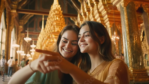 Happy young tourist women friends enjoy taking selfie together while travel in temple of the emerald buddha, Wat Phra Kaew, popular tourist place in Bangkok, Thailand,wide andel lens,