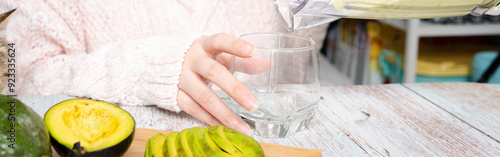 healthy eat and lifestyle with woman making avocado smoothie and play with her cat