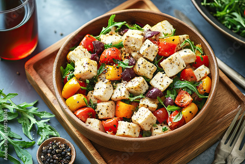 Healthy eating and diet concepts, Delectable Salad Bowl: A mouthwatering salad and chicken breast in a wooden bowl with colorful ingredients, perfect for a healthy meal.