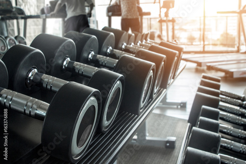 Healthy lifestyle fitness concept with rows of dumbbells and in the gym and a personal trainer for lifestyle concept for muscle building, strength, and weight loss with high contrast and monochrome.