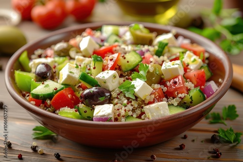 Healthy salad with quinoa feta olives tomatoes peppers celery onions and spices