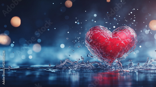 Heart of Water: A vibrant red heart, delicately sculpted from ice, is depicted at the center, its form kissed by droplets as it sits in a body of cool water.
