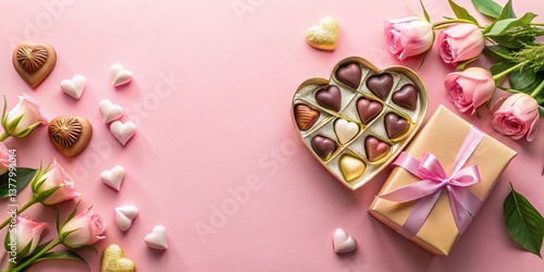 Heart-Shaped Chocolates, Pink Roses, and a Gift Box on a Pink Background A Romantic and Sweet Composition for Valentine's Day or Anniversary