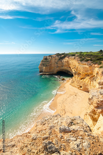 high cliffs on the shore of the Atlantic Ocean. Portugal. Algarve.