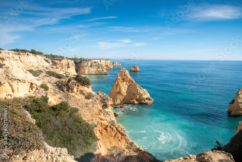 high cliffs on the shore of the Atlantic Ocean. Portugal. Algarve.