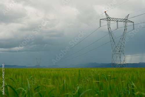 High voltage power lines in the fields on a stormy weather