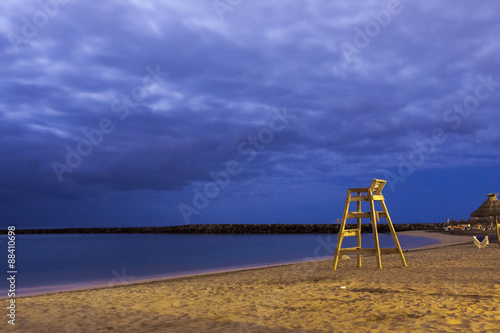 High wooden lifesaver chair on tropical sandy deserted beach night shoot