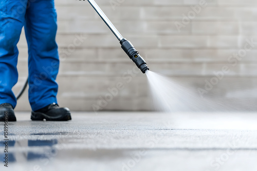 High-pressure cleaning in progress, worker in protective gear uses a power washer to clean a surface. A focused stream of water removes dirt and grime.
