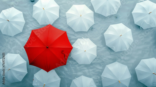 High-resolution photo capturing a sea of white umbrellas from a birds-eye view on a rainy day with one vibrant red umbrella in the center