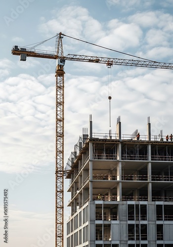 High-Rise Building under Construction with Tower Crane on a Partly Cloudy Day