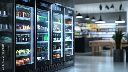 High-tech stock cupboard with digital labels, temperature-controlled compartments, futuristic design