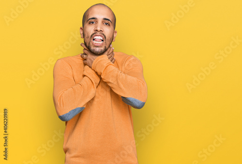 Hispanic adult man wearing casual winter sweater shouting and suffocate because painful strangle. health problem. asphyxiate and suicide concept.