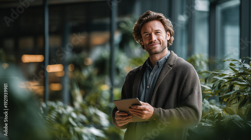 Hispanic businessman holding tablet in futuristic office with holographic technology