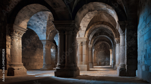 Historic cathedral corridor with stone arches and pillars