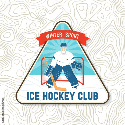 Hockey club logo, badge embroidered patch. Concept for shirt or logo, print, stamp or tee. Winter sport. Vector illustration. Hockey goalkeeper, goaltender protects the gate.