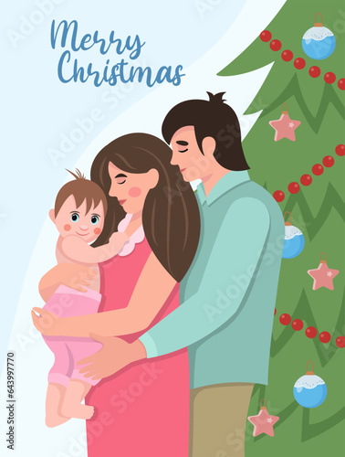 Holiday concept. Beautiful woman with a baby in her arms. The husband hugs his wife and child on the background of the Christmas tree. Cozy winter vector illustration in flat style. Newborn.