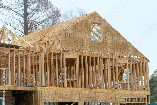 home construction the frame of the house on the foundation construction of a wooden cottage roof rafters