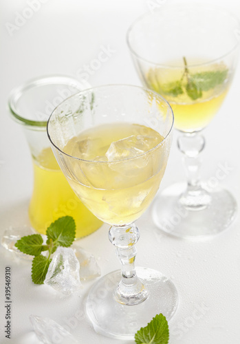 Homemade kiwi liqueur with ice, mint and vodka
