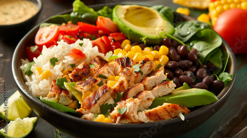 Homemade Mexican chicken burrito, full of the flavors of rice, beans, corn, tomato, avocado and spinach.