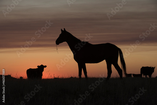 Horse silhouette at sunset, in the coutryside, La Pampa, Argentina.