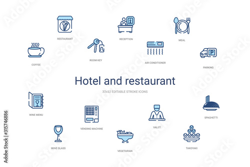 hotel and restaurant concept 14 colorful outline icons. 2 color blue stroke icons