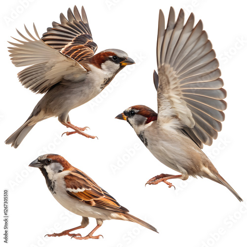 House sparrow bird in various poses including flying and perching natural wildlife.