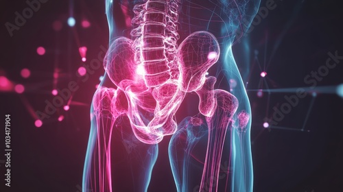 Human pelvis digital illustration, featuring a highlighted area to indicate pain or a specific medical condition, providing clear anatomical insights and educational value.