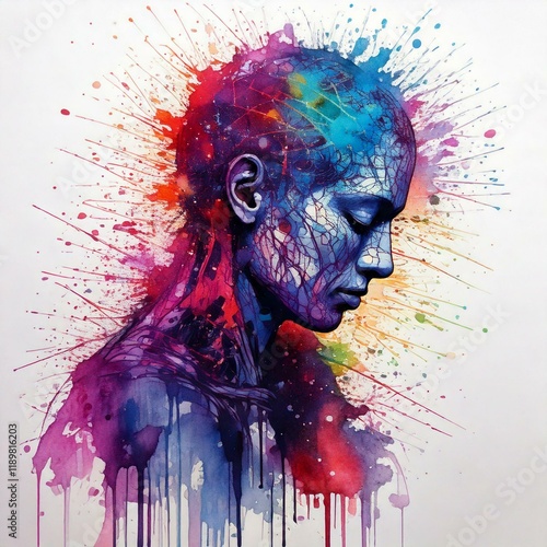 Human soul, watercolor representation of the human soul in pain, esoteric art, with ink splashes, ideal for esoteric art.