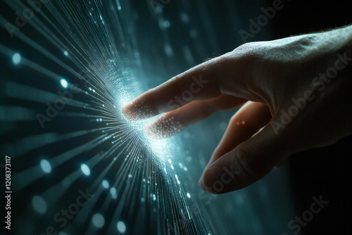 Human Touch Meets Glowing Abstract Energy with Futuristic Particles and Cosmic Light Networks Depicting Innovation and Digital Interaction