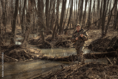Hunter man forest river spring with shotgun during hunting season