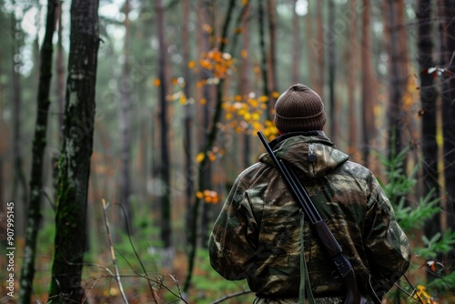hunter with a gun in the autumn vibrant sunny forest, banner with copy space