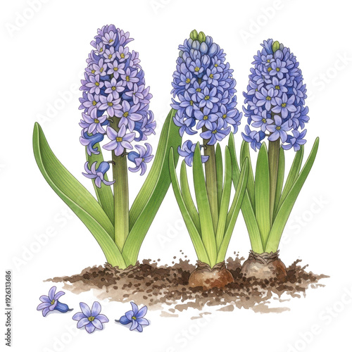 Hyacinth Blooms: Illustrating the vibrant beauty of three hyacinth blossoms, their delicate violet petals arranged in a vibrant display, and fresh green leaves.