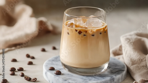 Iced coffee latte in a glass with milk and ice on a marble board on a light background