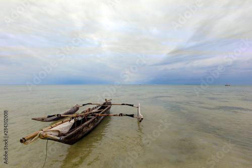 idylic outdoor scene with distant horizon calm ocean water and a dramatic clouded sky