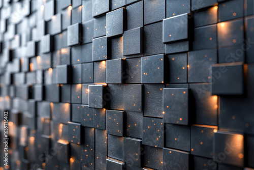 Illuminated black cubes form a unique textured wall, showcasing modern decor and ambiance in a stylish indoor setting