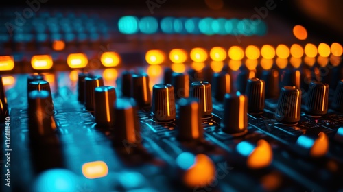 Illuminated knobs on sound mixer create vibrant atmosphere, showcasing intricate details of audio equipment. warm orange and cool blue lights enhance visual appeal