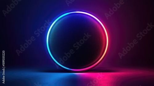 Illuminated sound speaker with vibrant neon lights in blue and pink set against a dark background, designed for an immersive audio experience.