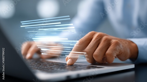 Illuminating innovation, person working on laptop with light emitting, symbolizing ideas and productivity.