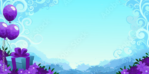 Illustration of a birthday background with gifts and balloons floating in sky,