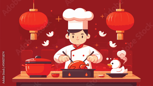 illustration of a Chinese chef who is cooking Peking duck in an all-red atmosphere for celebrating Lunar new year