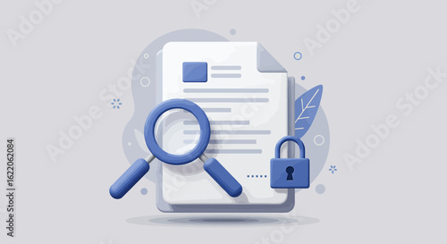 Illustration of a document being examined with a magnifying glass, secured with a padlock, and decorated with a feather.